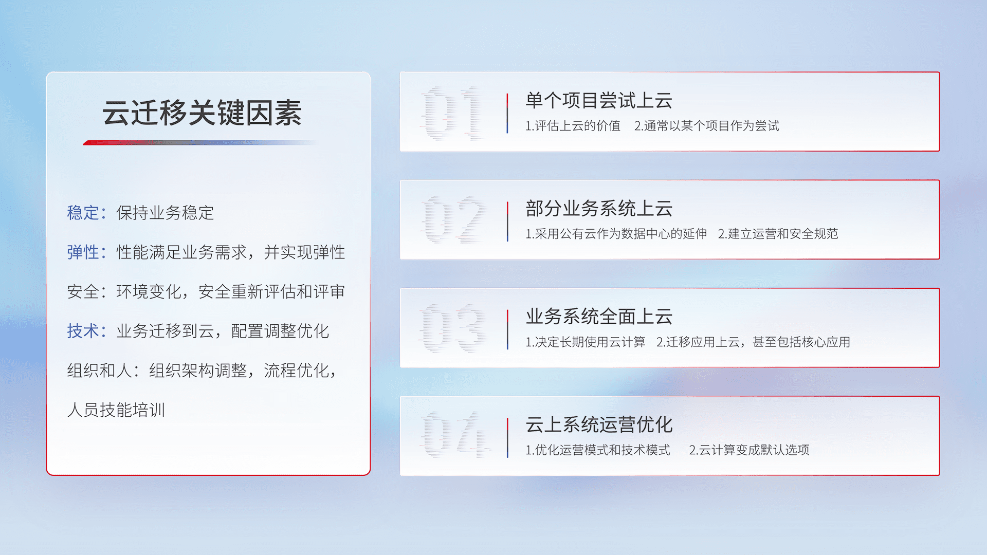 结合实际业务,,,从规划设计、、、、云平台选型、、云原生改造、、数据迁移、、、、集成交付,,,迁移全过程为客户识别最佳上云路径,,做好风险识别管理,,,,设计网络架构、、、身份权限、、安全审计合规、、、操作审计、、日志审计、、、、监控告警策略、、多站点容灾设计等,,对云上基础设施进行整体规划,,提升IT治理水平,,,,以满足弹性、、、高可用、、高性能的需求。。