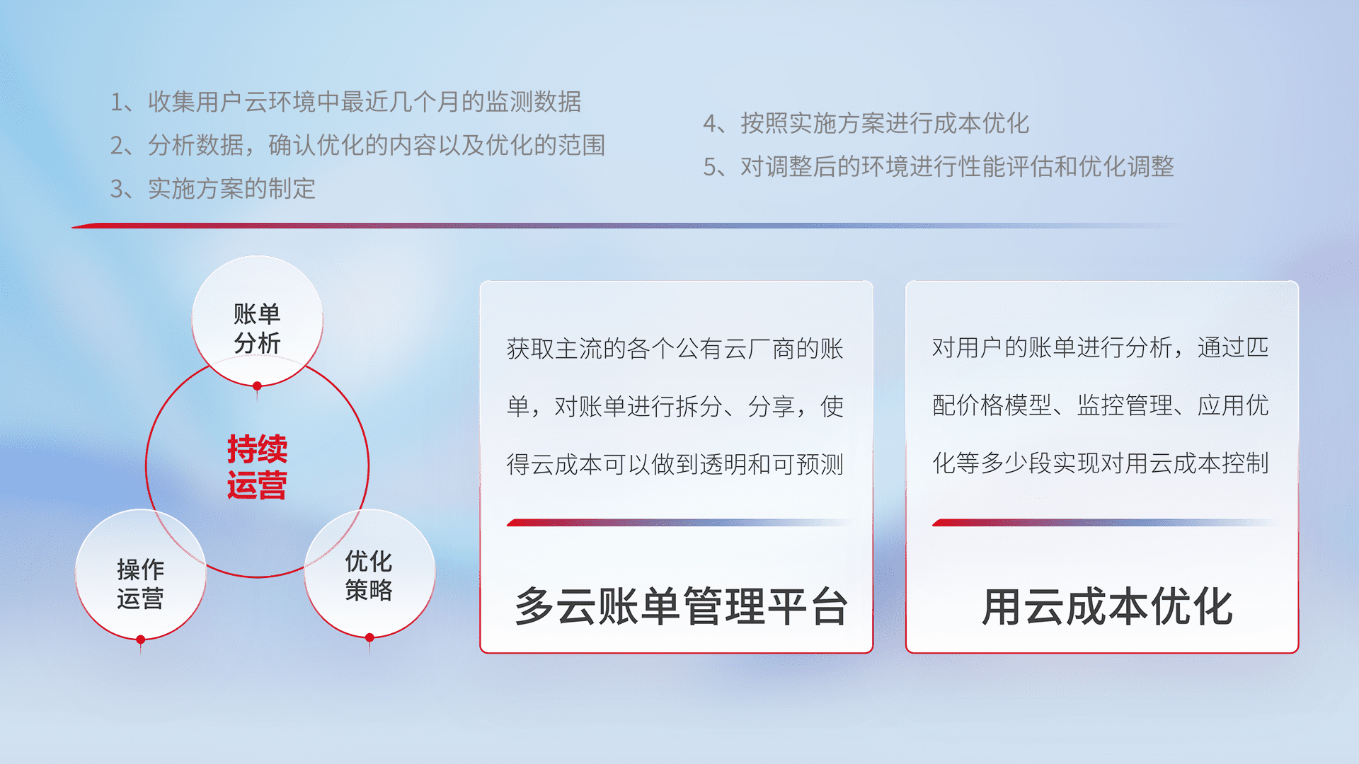 通过多云纳管,,,以统一的资源数据模型把客户的云资源进行抽象和封装,,,进而实现对多云资源的统一操作,,保障云资源管理的可靠性、、、、稳定性与可用性。。。量身定制化运维内容,,,配置、、开发运维、、补丁管理、、、备份、、、、监控、、、认证和访问管理、、、、审计和日常巡检等,,保障在用云过程中的可靠度,,稳定度以及高可用率。。。